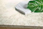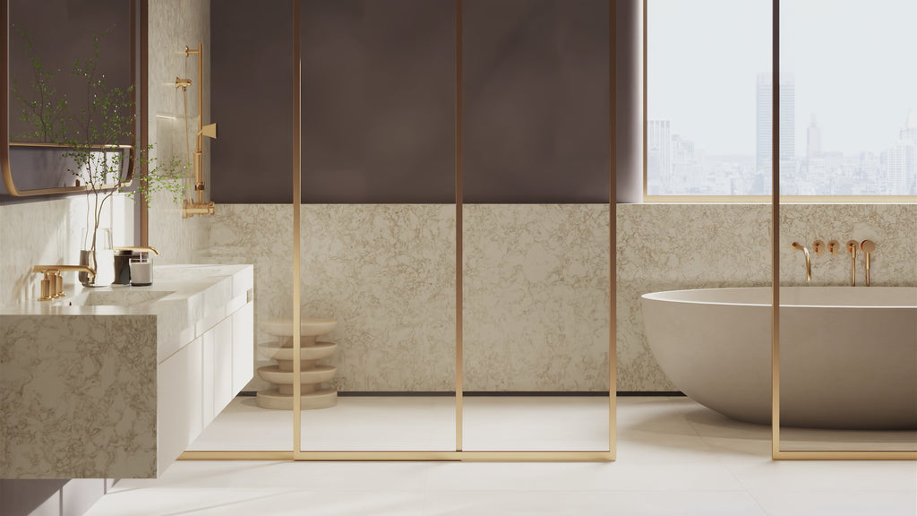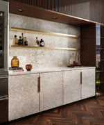 Delicate gold veining swirls in tight and open patterns, creating lighter and darker pools of color. This elegant warm design glistens.