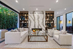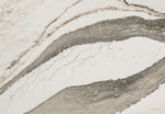 Set against a bone-white marbled backdrop, bold translucent olive green veins plunge in various directions with subtle white and black tributaries interspersed throughout.