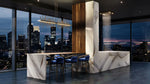 Chocolate brown streams converge along a cool white backdrop, their inviting translucence and momentous movement are punctuated by hints of brilliant brass. The alloy accent lightly traces the peaks and valleys of this flowing umber landscape for visual depth with a glint of glamour.